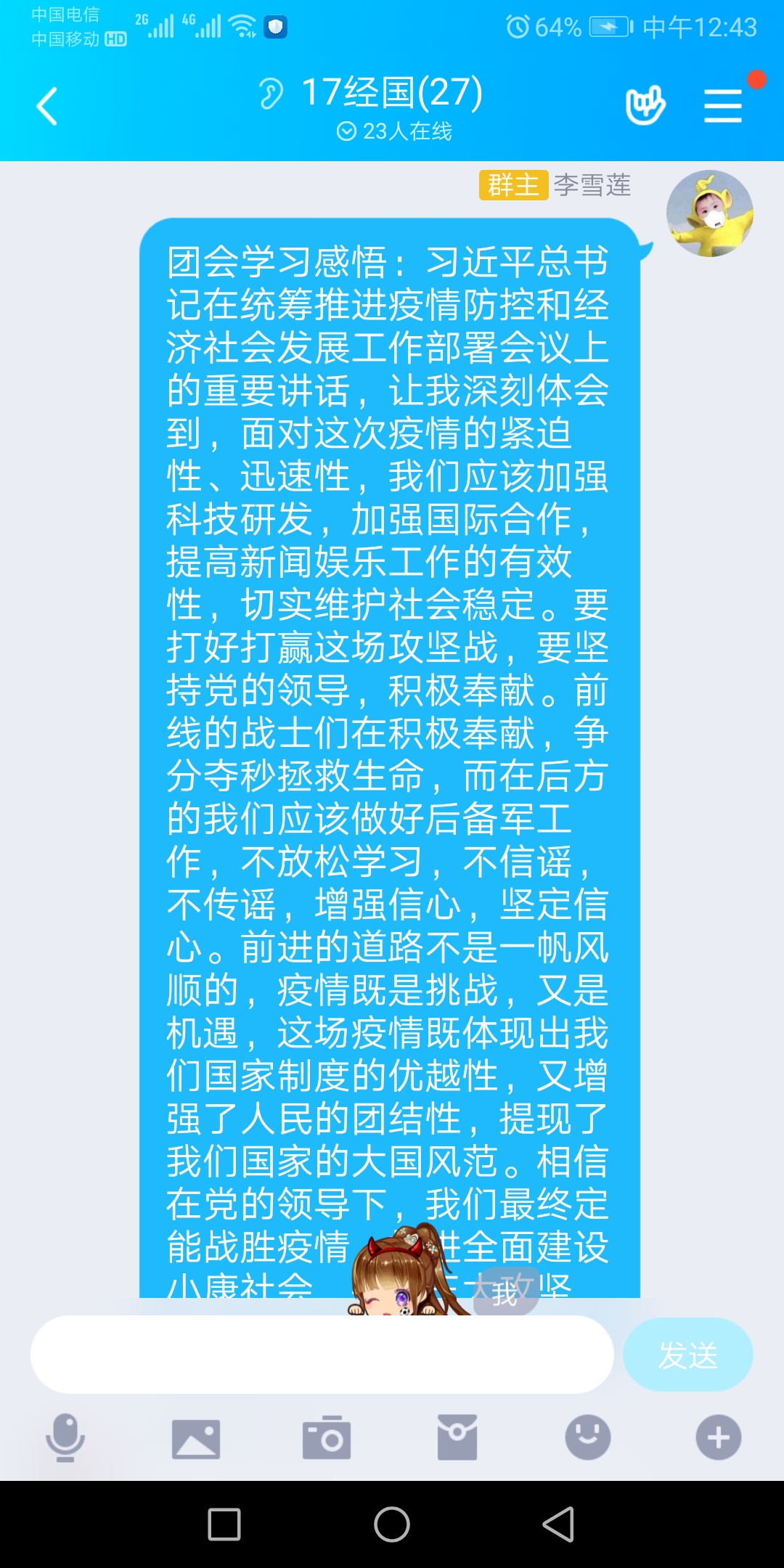 各团支部以“青春战疫,共克时艰”“青春抗疫,从我做起”“致敬抗疫英雄,让青春在战‘疫’中闪光”“众志成城同抗疫,青春聚力勇担当”“凝聚青春正能量,同心抗疫担使命”“致敬逆行者,共筑青春抗疫长城”等为主题,形式新颖,内容丰富多彩:带领团员青年认真学习领会习近平总书记此次回信精神,号召广大团员青年争做不惧风雨、勇挑重担的新时代青年;观看各行各业抗疫英雄的事迹视频、组织线上诗朗诵、分享身边的抗疫英雄事迹;手绘祝福语、录制短视频、线上同唱一首红歌,为武汉加油,为中国加油。各团支部还组织团员在团支部微信群、朋友圈等交流分享学习心得,广大青年纷纷表示将积极向抗疫英雄学习其家国情怀、担当精神、仁心大爱和奉献品德,努力将学习成果转化为勇于担当、甘于奉献、勤于进取的行动�