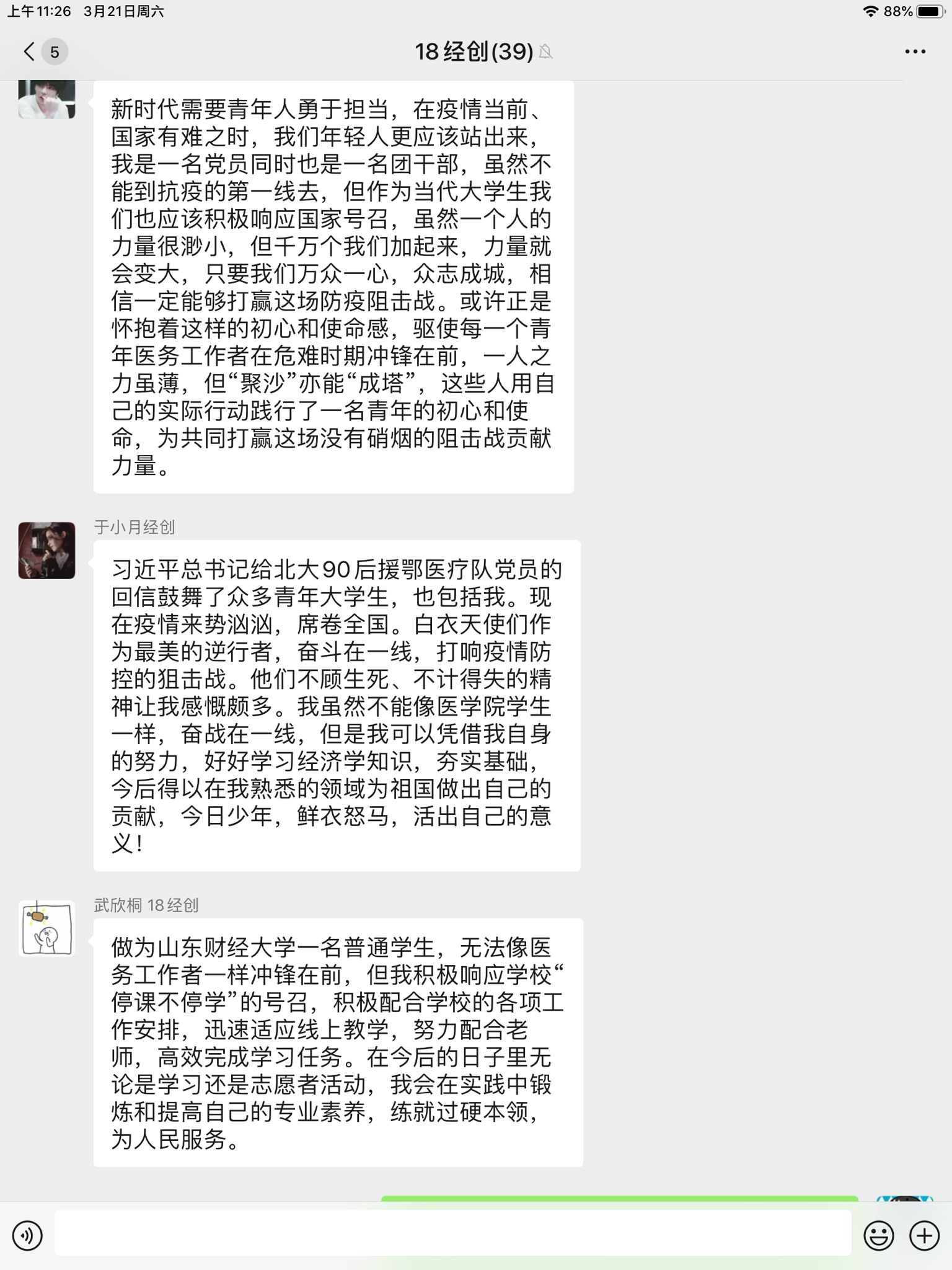 (通讯员:徐清� 常群)为深入学习贯彻习近平总书记给北京大学援鄂医疗队�90后”党员回信精神,广泛发动团员青年向在疫情防控一线担当奉献的青年学习,按照校团委有关要求,结合学院实际,3�18日至23日,经济学院各团支部依托网络平台开展学习习总书记给北京大学援鄂医疗队�90后”党员回信线上主题团日活动�