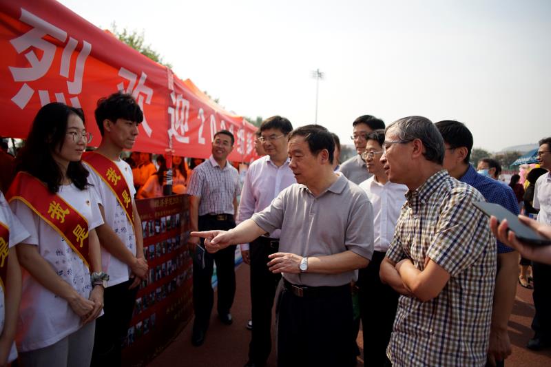 校党委书记王邵军、校长赵忠秀在学校相关部门陪同下莅临我院迎新现场,浏览学院迎新宣传板,询问学生报到情况,对我院迎新工作、党员服务岗的设立和现场宣传给予肯定�