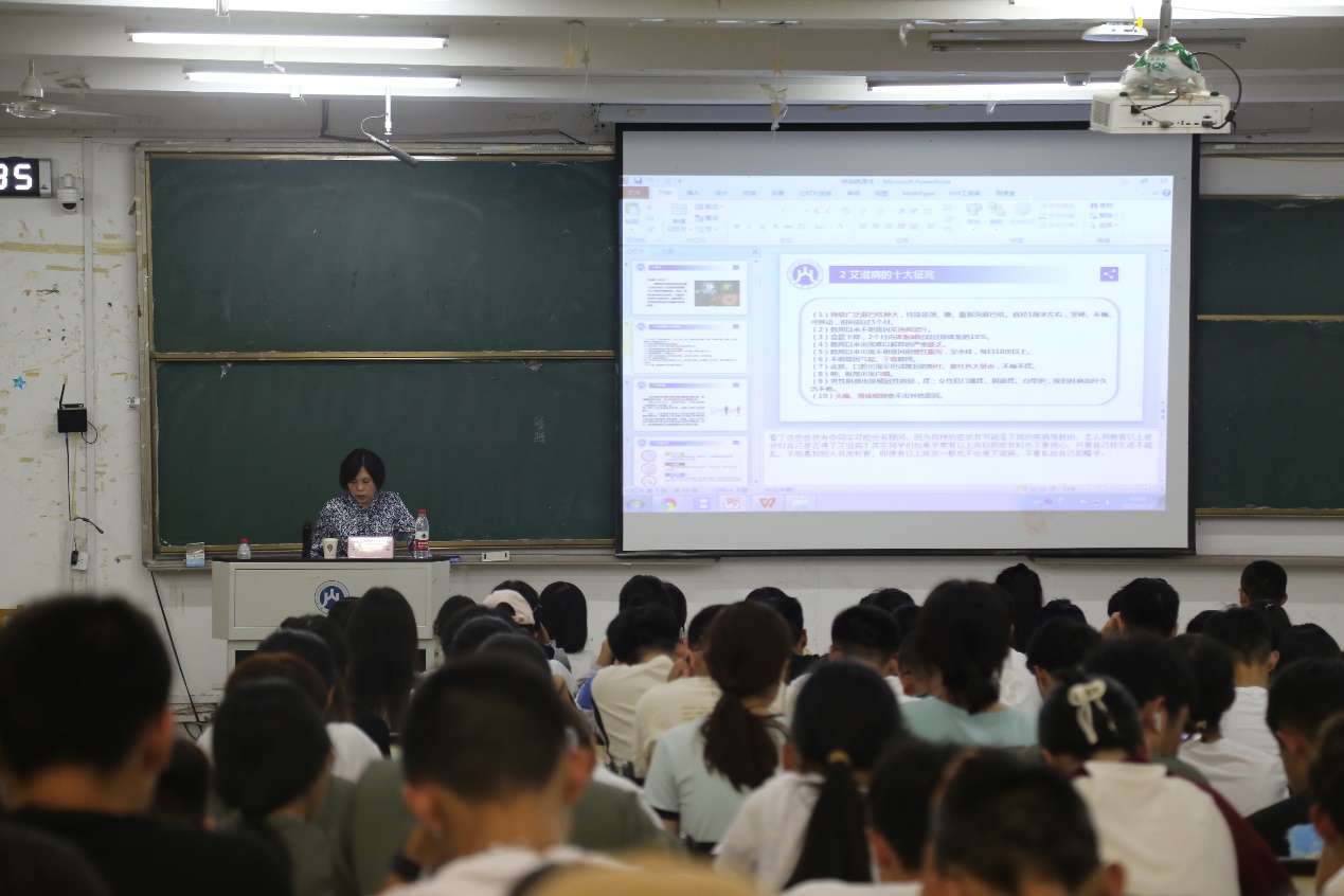 针对当下流行的一些传染病,李荣详细地为学生们介绍了其种类、传播途径、发病症状、危害以及防治措施。传染病防治,关键在于阻断传播,李荣指出,良好的生活行为习惯对于防治传染病有着密不可分的关系。在生活中,同学们应当养成勤洗手、勤通风、少聚集、公共场合佩戴口罩等良好习惯,减少感染可能性。出现病症后,应当及时上报并就医,早发现、早隔离、早治疗。随后,李荣讲述了传染病防控相关政策�