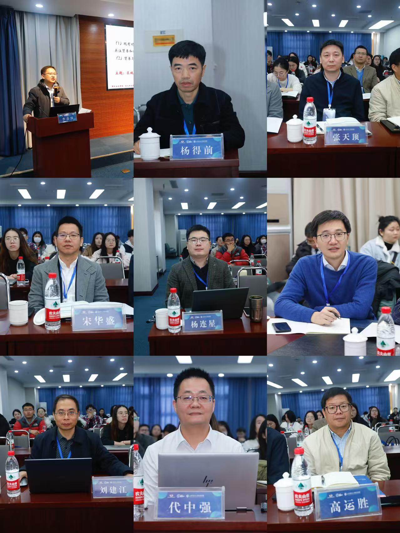 主旨论坛(四)分别由中国农业大学经济贸易系主任李春顶教授和集美大学财经学院院长杨得前教授主持。中国农业大学经济管理学院李春顶教授,上海对外经贸大学学术期刊社社长高运胜教授,武汉大学世界经济系主任张天顶教授,浙江大学经济学院宋华盛教授,华东师范大学经济与管理学院副院长杨连星教授,西南财经大学人事处副处长蒋为教授,长沙理工大学社科处处长刘建江教授,上海对外经贸大学国际经贸学院副院长代中强教授发表了题为“区域贸易协定的碳排放效应:统计证据与量化模拟”,“工业机器人应用、人口老龄化与制造业企业OFDI”,“发达国家机器人应用对中国的贸易与福利效应分析”,“Export Adjustment to Import Protectionism: The Role of Input-Output Linkages in the US-China Trade War”,“如何用好‘两个市场,两种资源’:基于国内生产网络与外资股权网络视角”,“劳动力通勤成本、技能互补性与城市出口比较优势”,“美欧高通胀何以重现?基于大变局下国际分工视角”,“国家知识产权示范城市提高了企业出口韧性吗?”等主旨演讲�