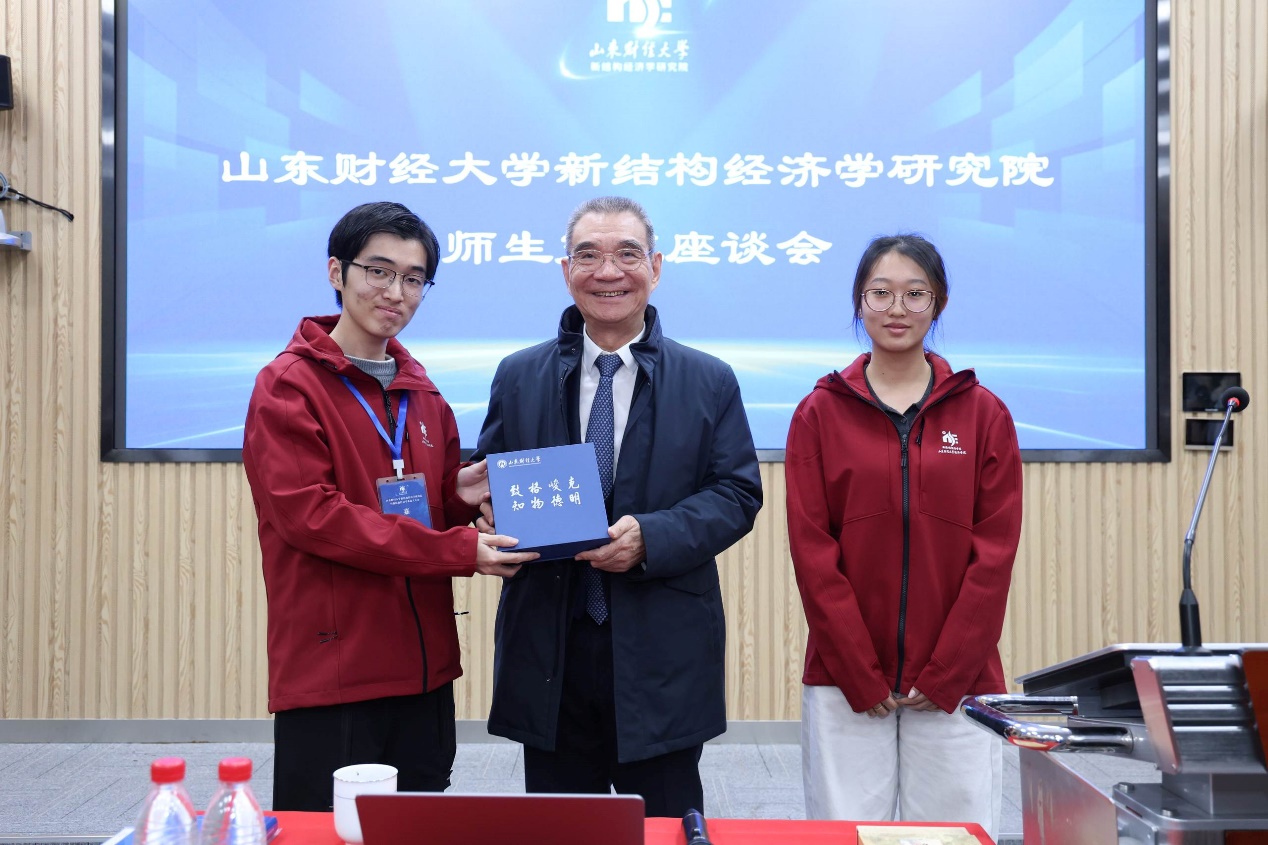 最后,殷克东向林毅夫赠送了精美礼物,并向林毅夫教授表示感谢。新结构经济学实验班同学代表向林毅夫和王勇献花,表达了崇高敬意�