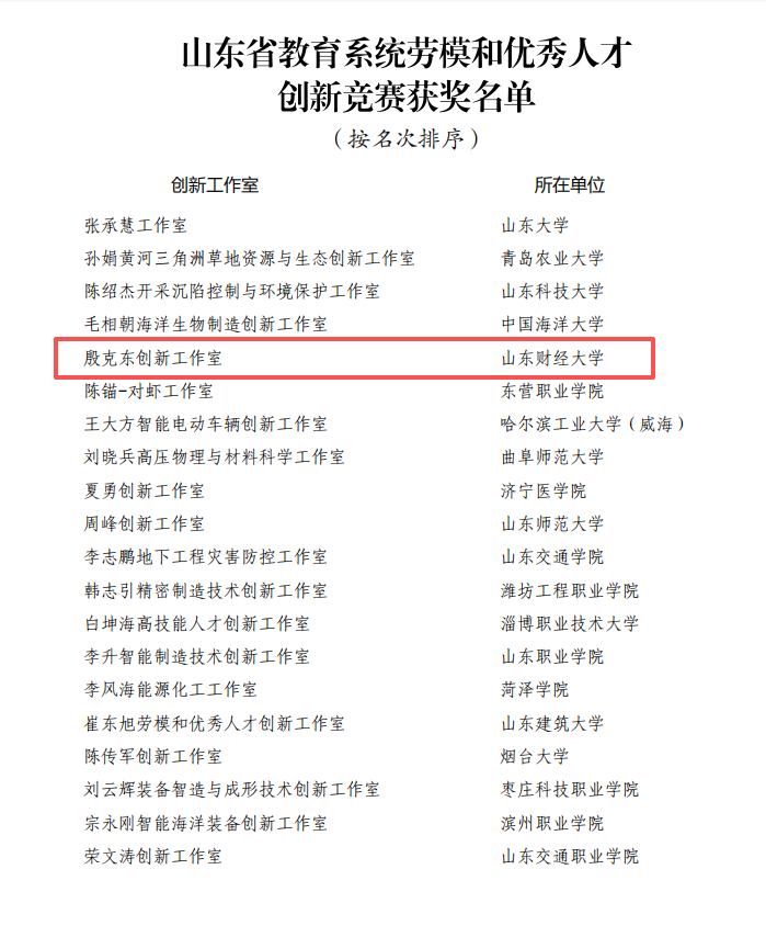 近日,山东省教育系统劳模和优秀人才创新竞赛获奖名单揭晓,殷克东创新工作室凭借优秀的团队建设、人才培养模式和突出的创新成果、社会效益,在全省众多参赛工作室中脱颖而出,荣登获奖名单�