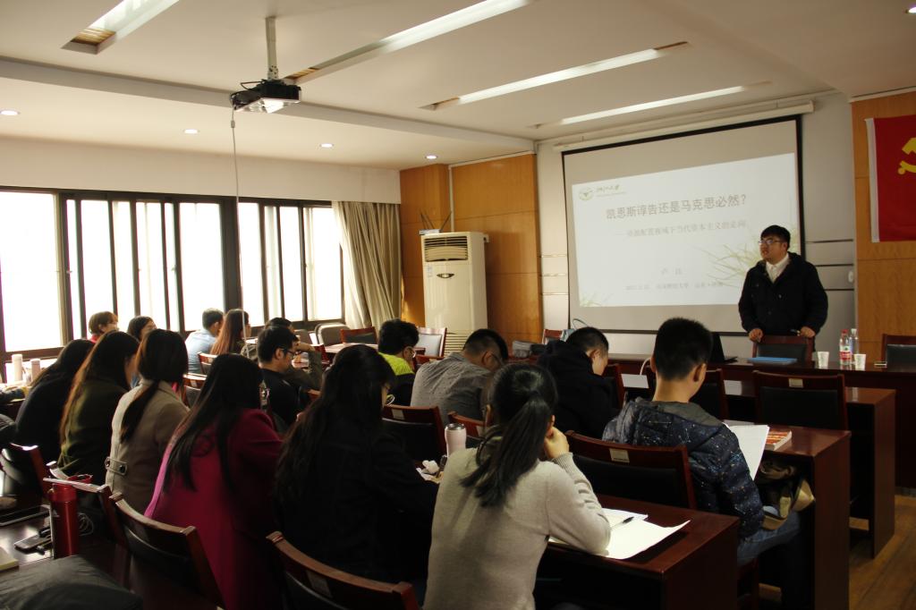 3�15日下午,浙江大学卢江副教授在天舜大厦六楼会议室为全院师生带来一场精彩的学术报告,题为�凯恩斯谆告还是马克思必然?——资源配置视域下当代资本主义的走�》�