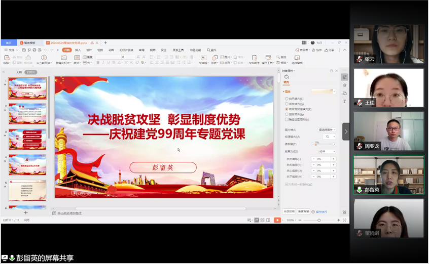 (通讯员:付雯孙俏俏)为热烈庆祝中国共产党建党99周年,贯彻落实全国全省基层党建工作重点任务推进会精神,根据中组部“党课开讲啦”活动安排和省委组织部、省委教育工委有关通知要求,按照校党委组织部“我来讲党课”活动部署,6�24日上午,经济学院学生第三党支部利用腾讯会议平台开展“决战脱贫攻坚,彰显制度优势”专题党课。本次党课由经济学院副院长彭留英教授主讲,经济学院学生第三党支部全体党员参加,党课由学生第三党支部书记付雯主持�