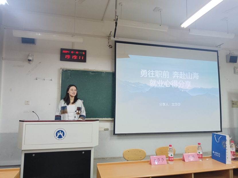 文莎莎以“勇往职前 奔赴山海”为主题,介绍了备考公务员与秋招的经历与心得。她讲解了考公岗位信息如何收集、考公岗位如何选择等,认为备考中需要打牢知识基础,厚积才能薄发;她认为同学们应当通过企业官方网站、公众号等多种路径收集岗位信息,强调了拓展求职信息来源的重要性�